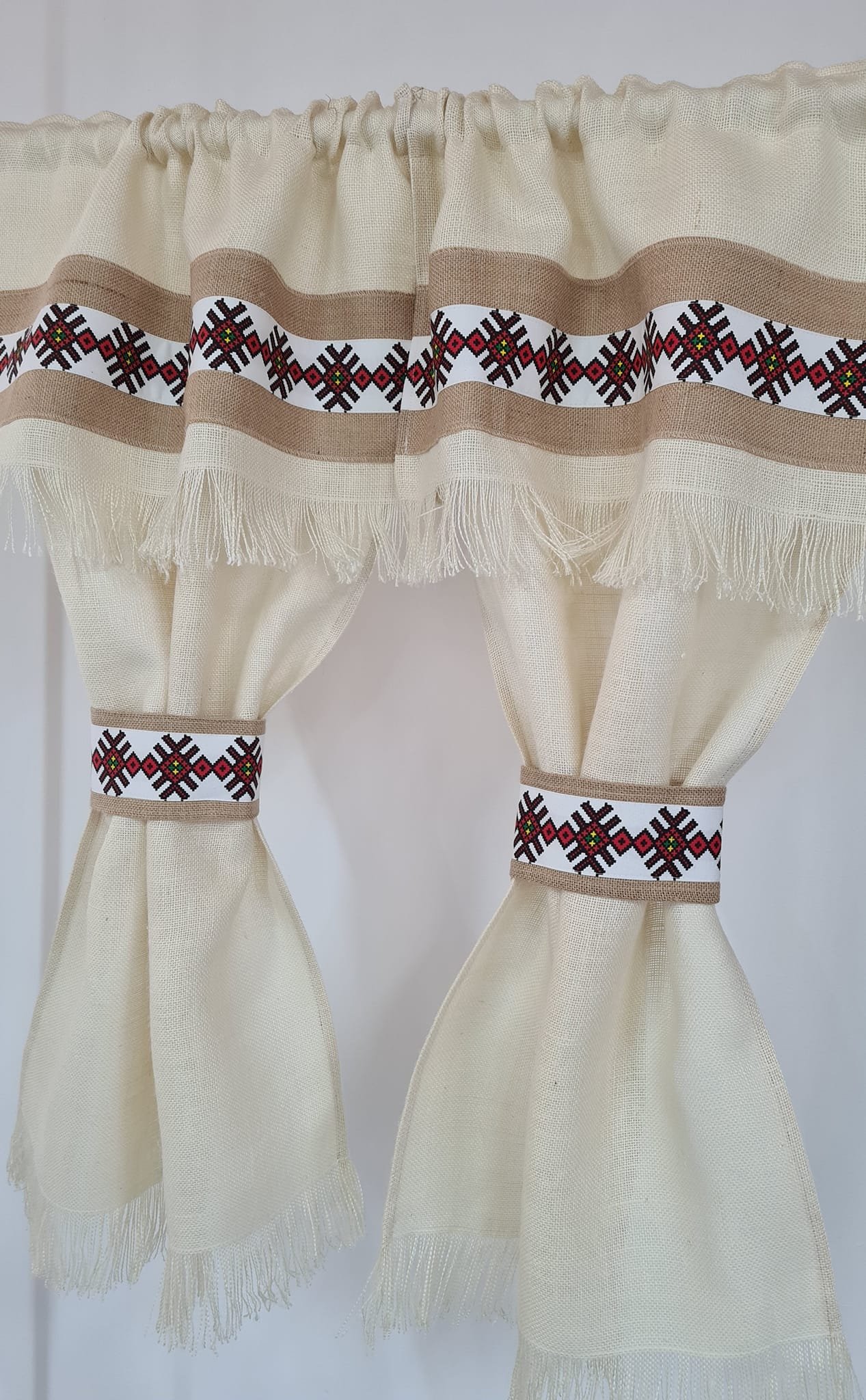 Perdele Rustice din Iuta Alba cu Bride si Motive Traditionale