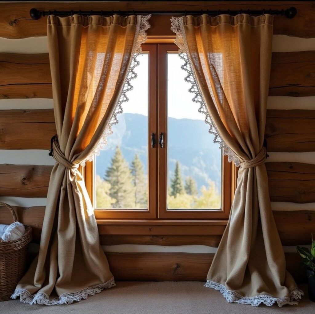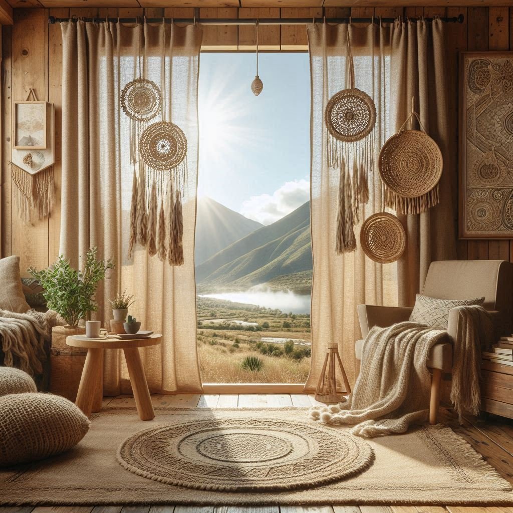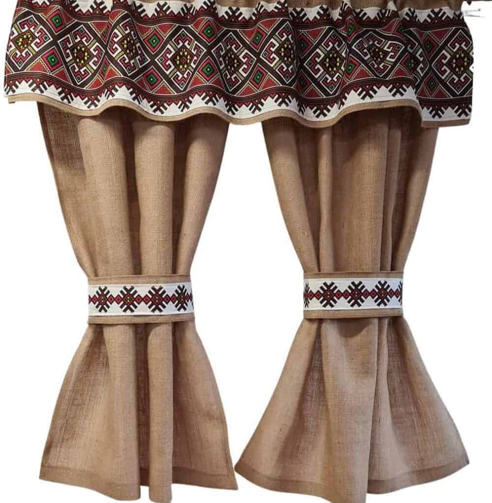Perdele Rustice din Iută Naturală cu Motive Traditionale Maro