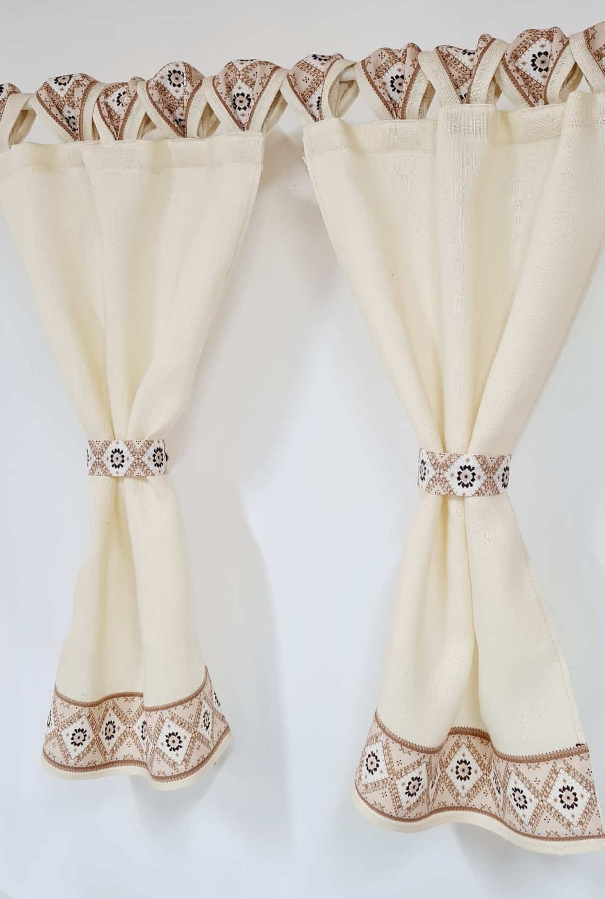 Perdele Rustice din Iută Alba cu Motive Traditionale Maro